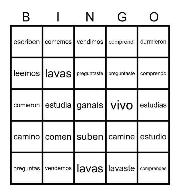 This bingo card has a free space and 34 words: preguntas, lavaste, tomaron, comimos, camino, lavas, durmieron, preguntas, comemos, ganasteis, preguntaste, vendimos, toman, vivi, vivo, comprendo, vendemos, comieron, comen, camine, suben, escribieron, escriben, estudias, lavas, comprendes, comprendi, abre, preguntaste, leemos, leimos, estudia, estudio and abriste.