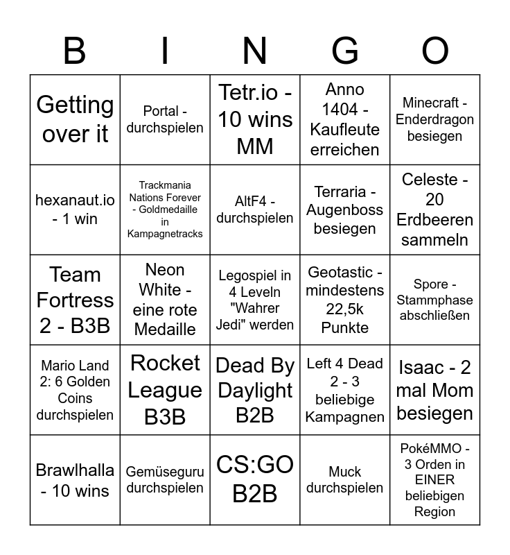 This bingo card has 25 words: Rocket League B3B, CS:GO B2B, AltF4 - durchspielen, Brawlhalla - 10 wins, Minecraft - Enderdragon besiegen, Getting over it, hexanaut.io - 1 win, Portal - durchspielen, Geotastic - mindestens 22,5k Punkte, Dead By Daylight B2B, Terraria - Augenboss besiegen, Team Fortress 2 - B3B, Left 4 Dead 2 - 3 beliebige Kampagnen, Isaac - 2 mal Mom besiegen, Trackmania Nations Forever - Goldmedaille in Kampagnetracks, PokéMMO - 3 Orden in EINER beliebigen Region, Spore - Stammphase abschließen, Tetr.io - 10 wins MM, Celeste - 20 Erdbeeren sammeln, Neon White - eine rote Medaille, Legospiel in 4 Leveln "Wahrer Jedi" werden, Gemüseguru durchspielen, Mario Land 2: 6 Golden Coins durchspielen, Anno 1404 - Kaufleute erreichen and Muck durchspielen.