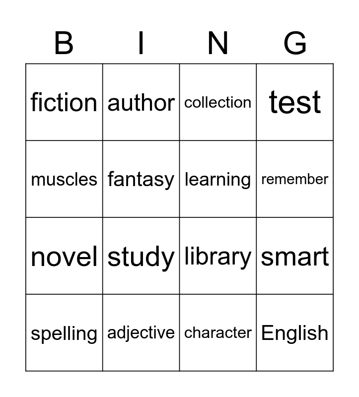 This bingo card has 16 words: adjective, smart, collection, fiction, novel, author, library, character, muscles, fantasy, spelling, test, study, remember, learning and English.