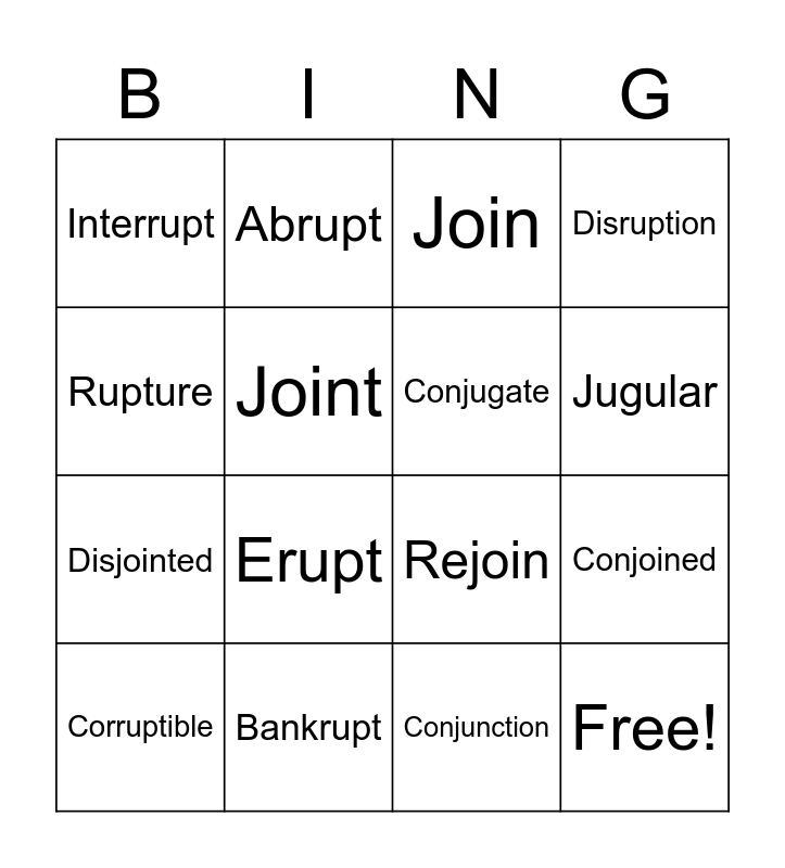 This bingo card has 16 words: Bankrupt, Conjoined, Join, Interrupt, Disjointed, Abrupt, Rejoin, Conjunction, Rupture, Joint, Corruptible, Disruption, Erupt, Jugular, Conjugate and Free!.