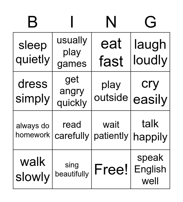 This bingo card has 17 words: Free!, walk slowly, eat fast, sleep quietly, read carefully, laugh loudly, talk happily, play outside, cry easily, get angry quickly, sing beautifully, wait patiently, dress simply, usually play games, always do homework, eat candies daily and speak English well.