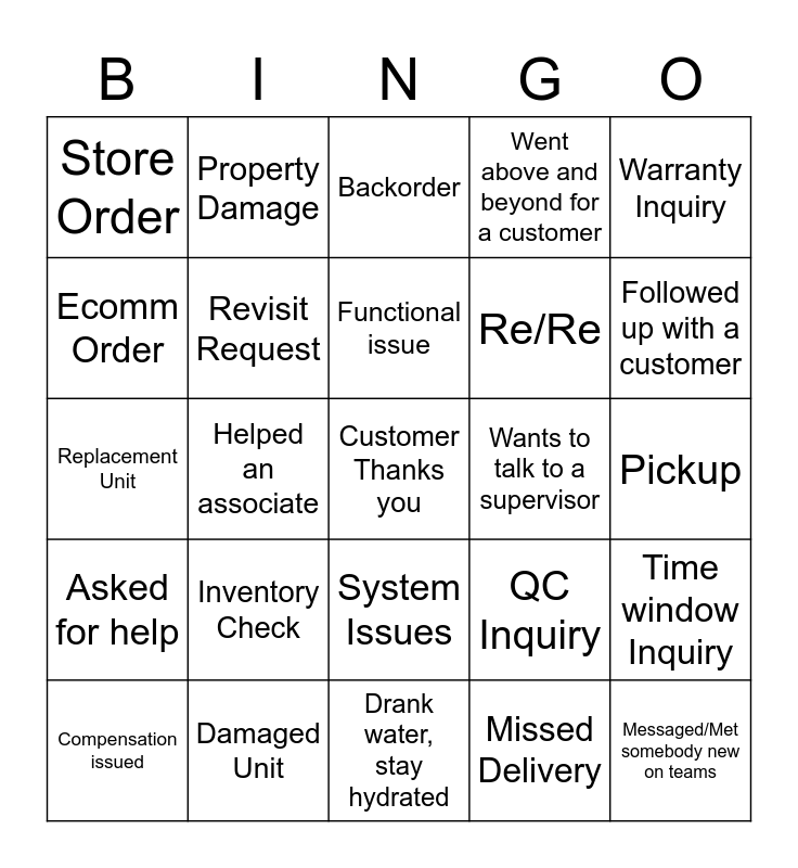 This bingo card has a free space and 24 words: Inventory Check, Damaged Unit, Functional issue, Compensation issued, Warranty Inquiry, Store Order, Ecomm Order, Property Damage, Wants to talk to a supervisor, System Issues, Re/Re, Replacement Unit, QC Inquiry, Time window Inquiry, Revisit Request, Missed Delivery, Pickup, Backorder, Followed up with a customer, Helped an associate, Messaged/Met somebody new on teams, Asked for help, Went above and beyond for a customer and Drank water, stay hydrated.