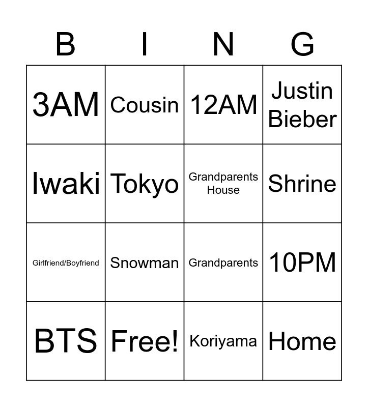 This bingo card has 16 words: Free!, 10PM, 12AM, 3AM, Girlfriend/Boyfriend, Cousin, Grandparents, Koriyama, Iwaki, Tokyo, BTS, Justin Bieber, Snowman, Shrine, Grandparents House and Home.