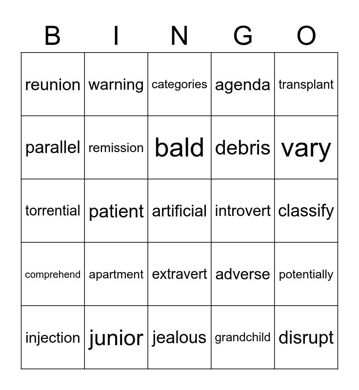 This bingo card has 25 words: apartment, jealous, bald, injection, transplant, reunion, parallel, warning, introvert, extravert, debris, torrential, adverse, potentially, remission, disrupt, classify, categories, vary, patient, artificial, junior, comprehend, agenda and grandchild.