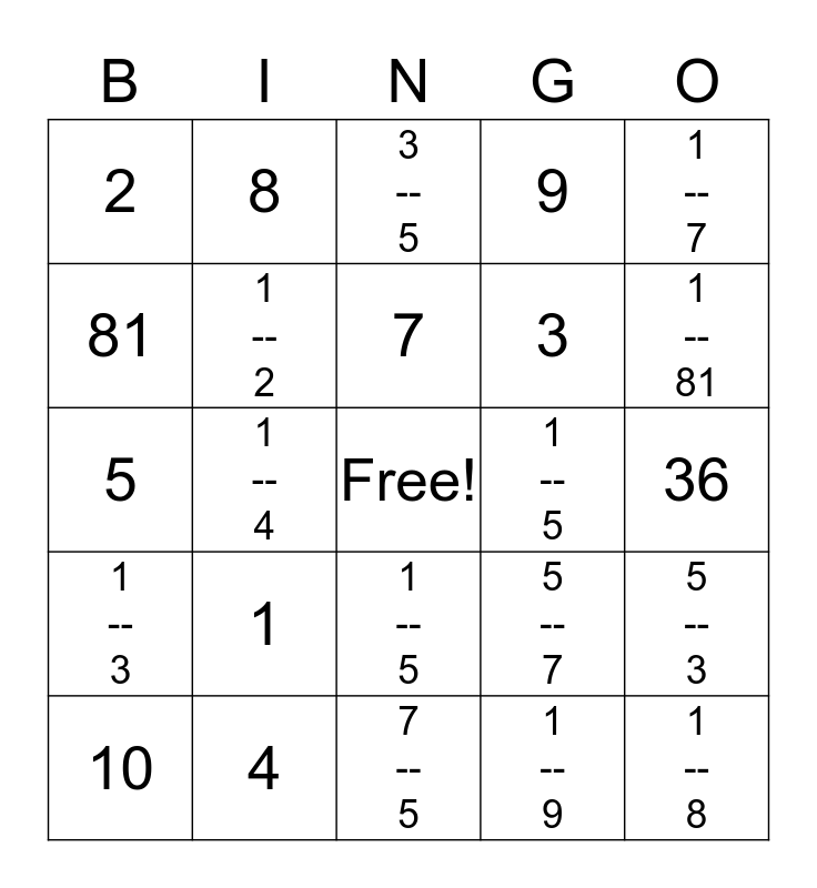 This bingo card has a free space and 24 words: 1, 4, 7, 10, 1 -- 7, 2, 81, 8, 1 -- 5, 1 -- 5, 3, 5, 5 -- 7, 5 -- 3, 1 -- 2, 1 -- 9, 36, 3 -- 5, 1 -- 81, 1 -- 4, 1 -- 8, 1 -- 3, 9 and 7 -- 5.