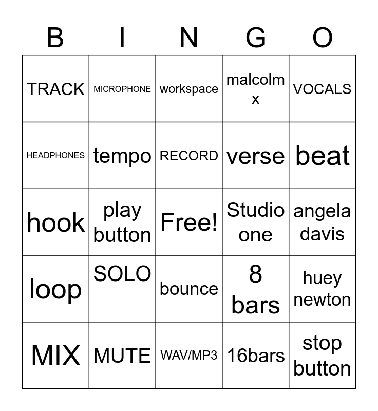 This bingo card has a free space and 24 words: SOLO, MUTE, RECORD, MIX, VOCALS, TRACK, HEADPHONES, MICROPHONE, Studio one, bounce, verse, hook, 8 bars, huey newton, tempo, 16bars, angela davis, workspace, beat, play button, stop button, loop, malcolm x and WAV/MP3.