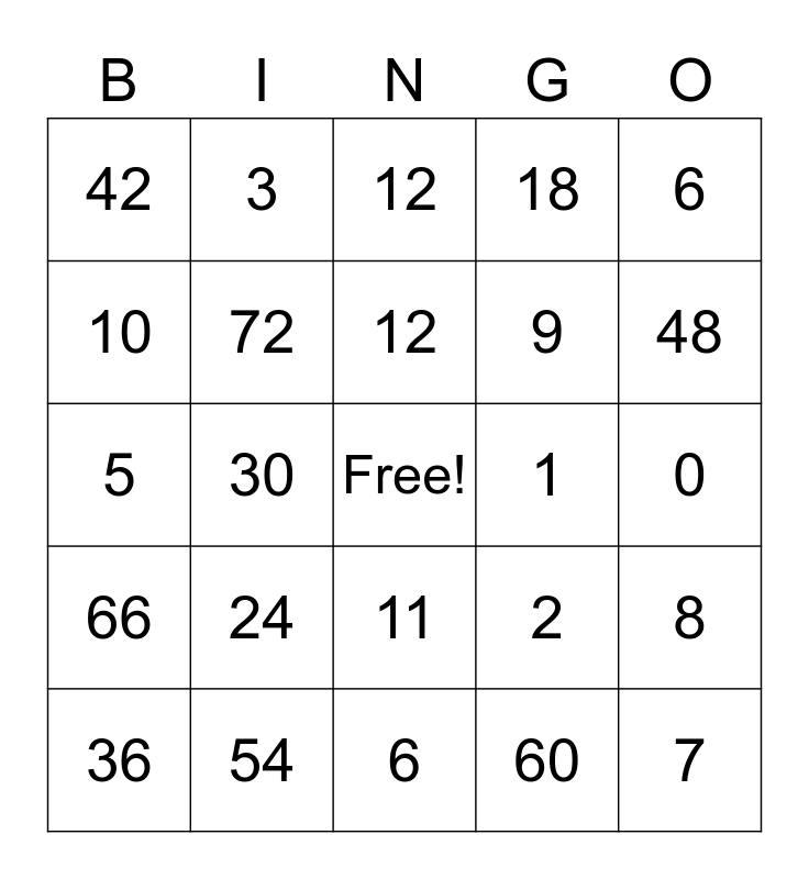 This bingo card has a free space and 25 words: 24, 6, 12, 36, 6, 42, 10, 3, 1, 11, 9, 5, 2, 8, 72, 4, 0, 12, 48, 30, 7, 54, 66, 18 and 60.