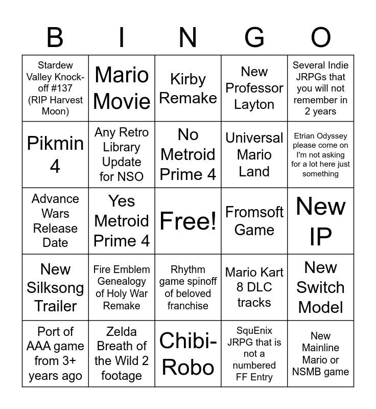 This bingo card has a free space and 24 words: Fire Emblem Genealogy of Holy War Remake, Zelda Breath of the Wild 2 footage, No Metroid Prime 4, Port of AAA game from 3+ years ago, Several Indie JRPGs that you will not remember in 2 years, Stardew Valley Knock-off #137 (RIP Harvest Moon), Pikmin 4, Mario Movie, Fromsoft Game, Rhythm game spinoff of beloved franchise, Universal Mario Land, Advance Wars Release Date, Mario Kart 8 DLC tracks, New Switch Model, Any Retro Library Update for NSO, SquEnix JRPG that is not a numbered FF Entry, New IP, Kirby Remake, Etrian Odyssey please come on I'm not asking for a lot here just something, Yes Metroid Prime 4, New Mainline Mario or NSMB game, New Silksong Trailer, New Professor Layton and Chibi-Robo.