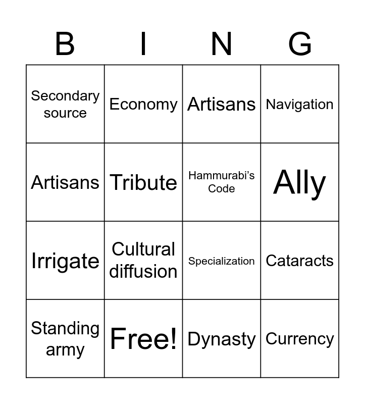 This bingo card has 25 words: Cavalry, Hieroglyphic, Ally, Mummy, Artisans, Secondary source, Tribute, Economy, Free!, Revolution, Irrigate, Specialization, Domesticate, Navigation, Hammurabi’s Code, Empire, Dynasty, Artisans, Cultural diffusion, Cataracts, Standing army, Economy, Currency, Navigation and Export.