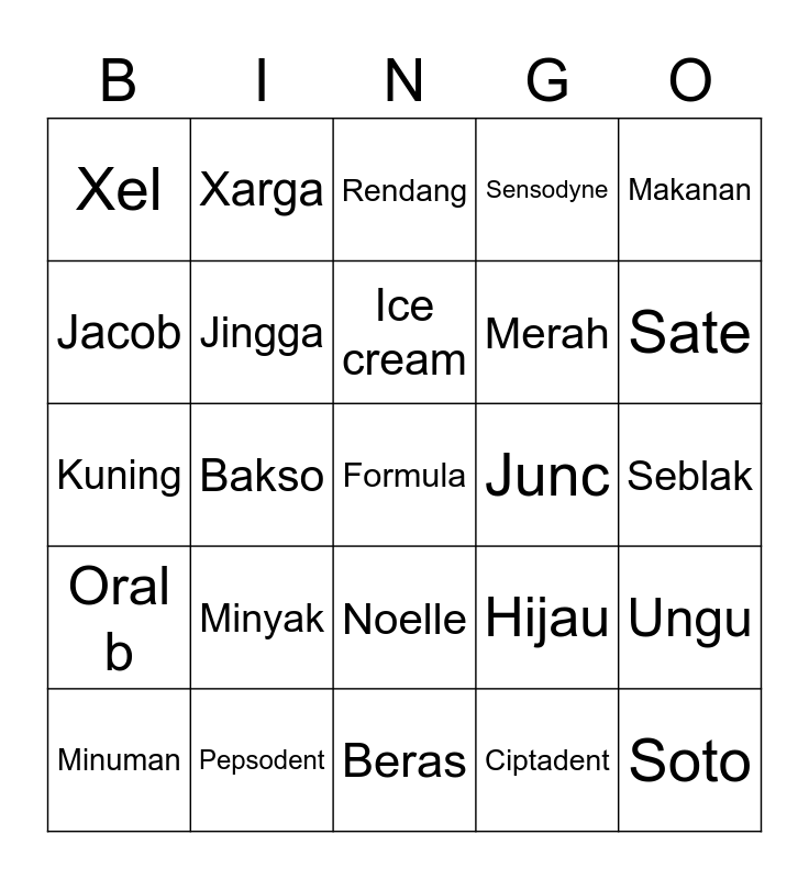This bingo card has 25 words: Minyak, Beras, Ice cream, Minuman, Makanan, Xel, Jacob, Xarga, Junc, Noelle, Merah, Kuning, Hijau, Ungu, Jingga, Soto, Seblak, Rendang, Sate, Bakso, Formula, Pepsodent, Oral b, Sensodyne and Ciptadent.