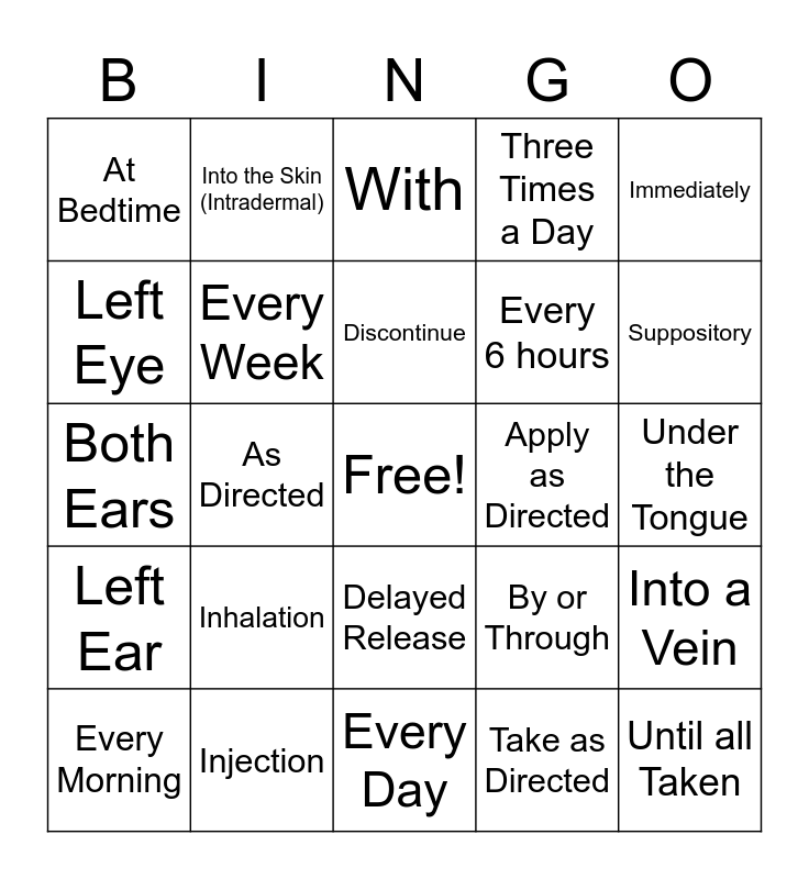 This bingo card has a free space and 55 words: Every Hour, Every Morning, Every Evening, At Bedtime, Every Day, Every Other Day, Every Week, Every Month, Every 6 hours, Twice a Day, Three Times a Day, Four Times a Day, As Needed, Before a Meal, After a Meal, With Food, Immediately, As Directed, While Awake, Until all Taken, Apply as Directed, Apply to Affected Area, By or Through, With, Without, Discontinue, Take as Directed, By Mouth, Under the Tongue, Into a Vein, Into a Muscle, Under the Skin, Both Eyes, Right Eye, Left Eye, Both Ears, Right Ear, Left Ear, Vaginally, Rectally, Into the Skin (Intradermal), Onto the Skin (Transdermal), Into an Artery (Intraarterial), Ointment, Inhalation, Injection, Drop, Syrup, Solution, Suppository, Suspension, Orally Disintegrating tablet, Extended Release, Delayed Release and Enteric Coated.