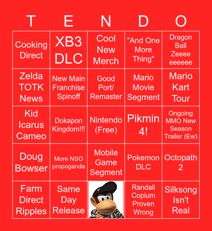 This bingo card has 1 images, a free space and 23 words: More NSO propoganda, Same Day Release, Good Port/ Remaster, Farm Direct Ripples, Dragon Ball Zeeee eeeeee, Cooking Direct, Zelda TOTK News, XB3 DLC, Pikmin 4!, Mobile Game Segment, Mario Movie Segment, Kid Icarus Cameo, Pokemon DLC, Octopath 2, New Main Franchise Spinoff, Randall Copium Proven Wrong, Ongoing MMO New Season Trailer (Ew), Cool New Merch, Mario Kart Tour, Dokapon Kingdom!!!, Silksong Isn't Real, Doug Bowser and "And One More Thing".
