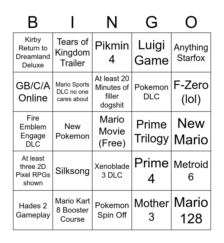 This bingo card has a free space and 24 words: Hades 2 Gameplay, Silksong, At least 20 Minutes of filler dogshit, Mother 3, Anything Starfox, Kirby Return to Dreamland Deluxe, Tears of Kingdom Trailer, Pikmin 4, Prime Trilogy, New Mario, Fire Emblem Engage DLC, Mario Sports DLC no one cares about, Prime 4, Metroid 6, GB/C/A Online, Mario Kart 8 Booster Course, Pokemon Spin Off, Luigi Game, F-Zero (lol), At least three 2D Pixel RPGs shown, New Pokemon, Xenoblade 3 DLC, Pokemon DLC and Mario 128.
