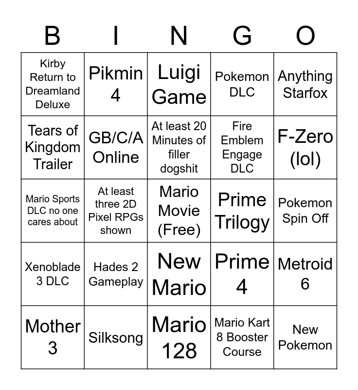 This bingo card has a free space and 24 words: Hades 2 Gameplay, Silksong, At least 20 Minutes of filler dogshit, Mother 3, Anything Starfox, Kirby Return to Dreamland Deluxe, Tears of Kingdom Trailer, Pikmin 4, Prime Trilogy, New Mario, Fire Emblem Engage DLC, Mario Sports DLC no one cares about, Prime 4, Metroid 6, GB/C/A Online, Mario Kart 8 Booster Course, Pokemon Spin Off, Luigi Game, F-Zero (lol), At least three 2D Pixel RPGs shown, New Pokemon, Xenoblade 3 DLC, Pokemon DLC and Mario 128.