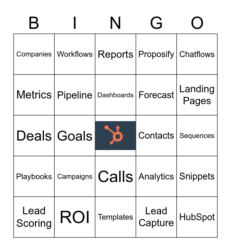 This bingo card has a free space and 24 words: Campaigns, ROI, Dashboards, Lead Scoring, Chatflows, Companies, Metrics, Workflows, Contacts, Calls, Forecast, Deals, Analytics, Snippets, Pipeline, Lead Capture, Sequences, Reports, Landing Pages, Goals, HubSpot, Playbooks, Proposify and Templates.
