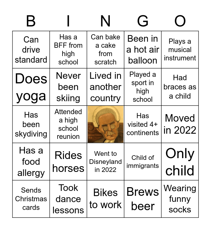 This bingo card has a free space and 64 words: Knows ASL, Collects something, Can do basic car repairs, Only child, Has been on TV, Can surf, Has a BFF from high school, In a wedding party in 2022, Lived in another country, Visited a national park in 2022, Went to Disneyland in 2022, Took a how-to class in 2022, Moved in 2022, Plays a musical instrument, Has season tickets, Does yoga, Attended a high school reunion, Can drive standard, Wears contact lenses, Played a sport in high school, Rides horses, Has a food allergy, Been in a hot air balloon, Has a tattoo, Owns a VHS player, Knows a martial art, Named after a relative, Been on a cruise, Is left-handed, Failed first driver test, Started a club, Has broken a bone, Ran in a marathon, Vegetarian, Had braces as a child, Sends Christmas cards, Worked at a family business, Brews beer, Creates art, Never been skiing, Has been skydiving, Has visited 4+ continents, Drinks 3+ cups of coffee/day, Bought a car in 2022, Related to a judge, Wearing funny socks, Took dance lessons, Has worked here 5+ years, Child of immigrants, Sings in a choir, Never flown in a float plane, Gardens, Bikes to work, Born outside BC, Has an iPad, Never ridden a bicycle, Can bake a cake from scratch, Carpools, Wakes up before 5 a.m., Fluent in a second language, Can tie a bow, Has been to a circus, Has met a famous person and Subject of a Law Society complaint.