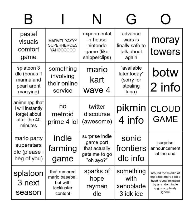 This bingo card has a free space and 24 words: indie farming game, that rumored mario baseball but with lackluster content, mario kart wave 4, splatoon 3 next season, moray towers, pastel visuals comfort game, splatoon 3 dlc (bonus if marina and pearl arent marrying), MARVEL YAYYY SUPERHEROES YAHOOOOOO, pikmin 4 info, surprise indie game port that actually gets me to go "oh ayo?", "available later today" (sorry for stealing luna), anime rpg that i will instantly forget about after the 40 minutes, sonic frontiers dlc info, surprise announcement at the end, something involving their online service, something with xenoblade 3 idk idc, CLOUD GAME, experimental in-house nintendo game (like snipperclips), botw 2 info, no metroid prime 4 lol, around the middle of the direct there'll be a hype reveal followed by a random indie rpg i completely ignore, mario party superstars dlc (please i beg of you), advance wars is finally safe to talk about again and sparks of hope rayman dlc.