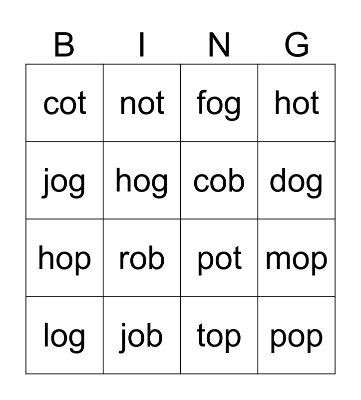This bingo card has a free space and 15 words: log, pop, fog, cot, dog, jog, rob, top, hog, hop, mop, hot, cob, not and job.