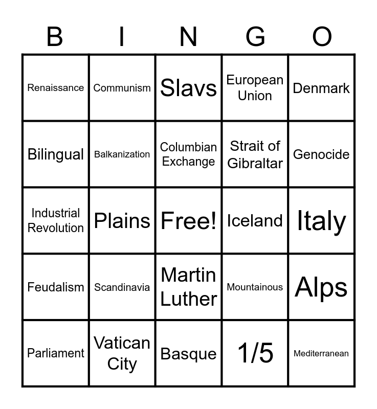 This bingo card has a free space and 33 words: English Channel, Steppe, Plains, Chunnel, Feudalism, Balkanization, Denmark, Parliament, Communism, Capitalism, Columbian Exchange, Slavs, Vikings, Indulgences, Iceland, Genocide, Vatican City, Industrial Revolution, Scandinavia, Mountainous, Martin Luther, Crusades, Renaissance, Italy, Basque, Mediterranean, European Union, Strait of Gibraltar, Bilingual, Alps, Galileo, 1/5 and Ice Sheets.
