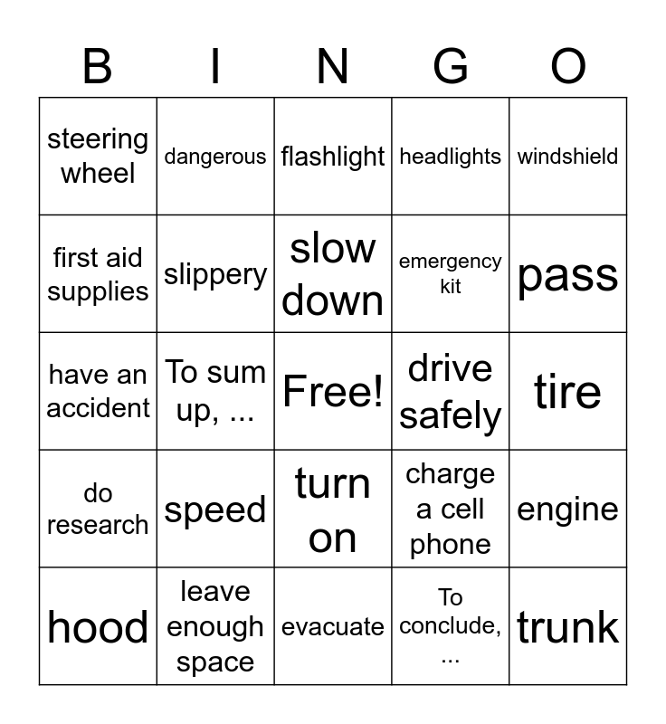 This bingo card has a free space and 27 words: charge a cell phone, electricity, emergency kit, evacuate, first aid supplies, flashlight, dangerous, do research, drive safely, engine, have an accident, headlights, hood, leave enough space, pass, slam on your brakes, slippery, slow down, speed, steering wheel, tire, To conclude, ..., To sum up, ..., trunk, turn on, windshield and windshield wiper.