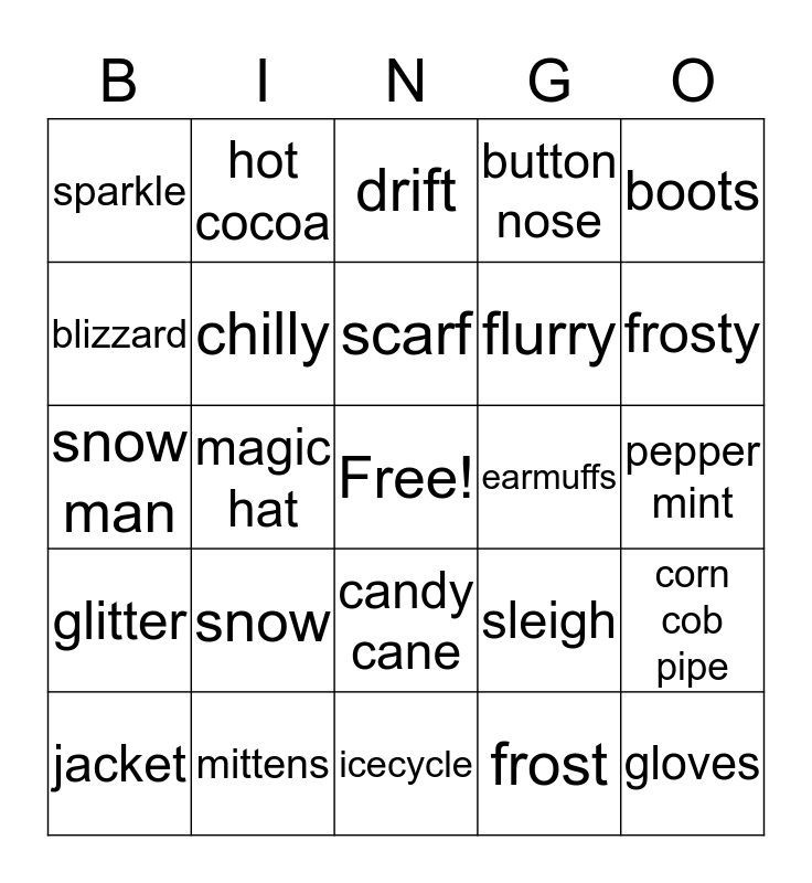 This bingo card has a free space and 24 words: snow, mittens, scarf, jacket, boots, sparkle, blizzard, hot cocoa, earmuffs, candy cane, flurry, snow man, sleigh, corn cob pipe, chilly, frost, pepper mint, drift, frosty, magic hat, gloves, glitter, button nose and icecycle.