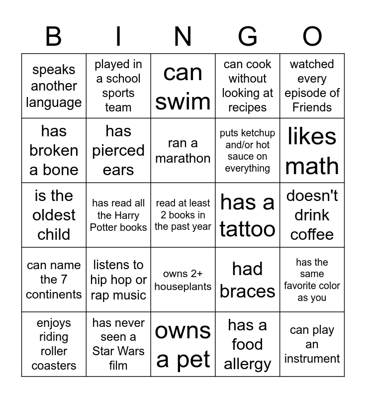 This bingo card has 25 words: listens to hip hop or rap music, owns a pet, ran a marathon, enjoys riding roller coasters, watched every episode of Friends, speaks another language, has broken a bone, played in a school sports team, has a tattoo, owns 2+ houseplants, puts ketchup and/or hot sauce on everything, is the oldest child, had braces, has the same favorite color as you, has pierced ears, can play an instrument, doesn't drink coffee, can swim, likes math, has read all the Harry Potter books, read at least 2 books in the past year, has never seen a Star Wars film, can name the 7 continents, can cook without looking at recipes and has a food allergy.