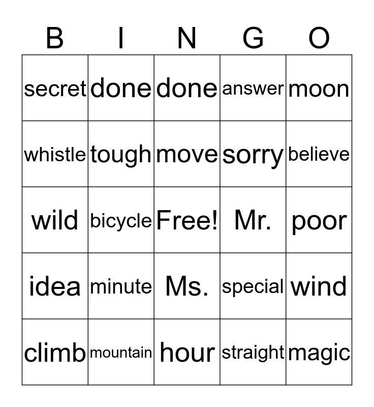 This bingo card has a free space and 24 words: minute, mountain, move, climb, moon, secret, whistle, done, Mr., Ms., sorry, wild, special, wind, tough, straight, poor, done, believe, bicycle, magic, idea, answer and hour.