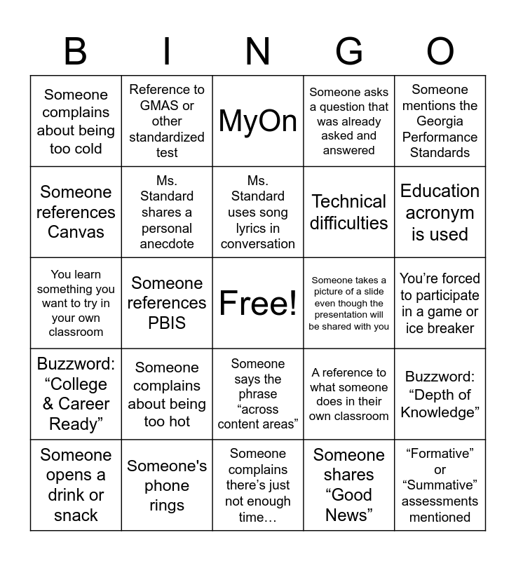 This bingo card has a free space and 27 words: A reference to what someone does in their own classroom, Ms. Standard says “I’ll get back to you…”, Technical difficulties, Someone complains there’s just not enough time…, Someone references Canvas, MyOn, Reference to GMAS or other standardized test, Buzzword: “College & Career Ready”, Someone takes a picture of a slide even though the presentation will be shared with you, Buzzword: “Depth of Knowledge”, You learn something you want to try in your own classroom, Someone asks a question that was already asked and answered, Someone opens a drink or snack, Someone's phone rings, Education acronym is used, Quote from an education “expert”, Ms. Standard shares a personal anecdote, Ms. Standard uses song lyrics in conversation, Someone complains about being too hot, Someone complains about being too cold, You’re forced to participate in a game or ice breaker, Someone shares “Good News”, Someone references PBIS, “Formative” or “Summative” assessments mentioned, Someone says the phrase “across content areas”, Someone mentions the Georgia Performance Standards and Buzzword: “COVID” gaps.
