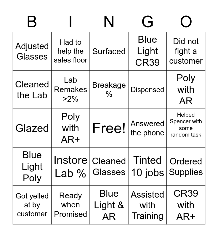 This bingo card has a free space and 24 words: Instore Lab %, Ready when Promised, Breakage %, Got yelled at by customer, Did not fight a customer, Adjusted Glasses, Cleaned the Lab, Had to help the sales floor, Answered the phone, Cleaned Glasses, Dispensed, Glazed, Tinted 10 jobs, Ordered Supplies, Lab Remakes >2%, Assisted with Training, Helped Spencer with some random task, Surfaced, Poly with AR, Poly with AR+, CR39 with AR+, Blue Light Poly, Blue Light CR39 and Blue Light & AR.