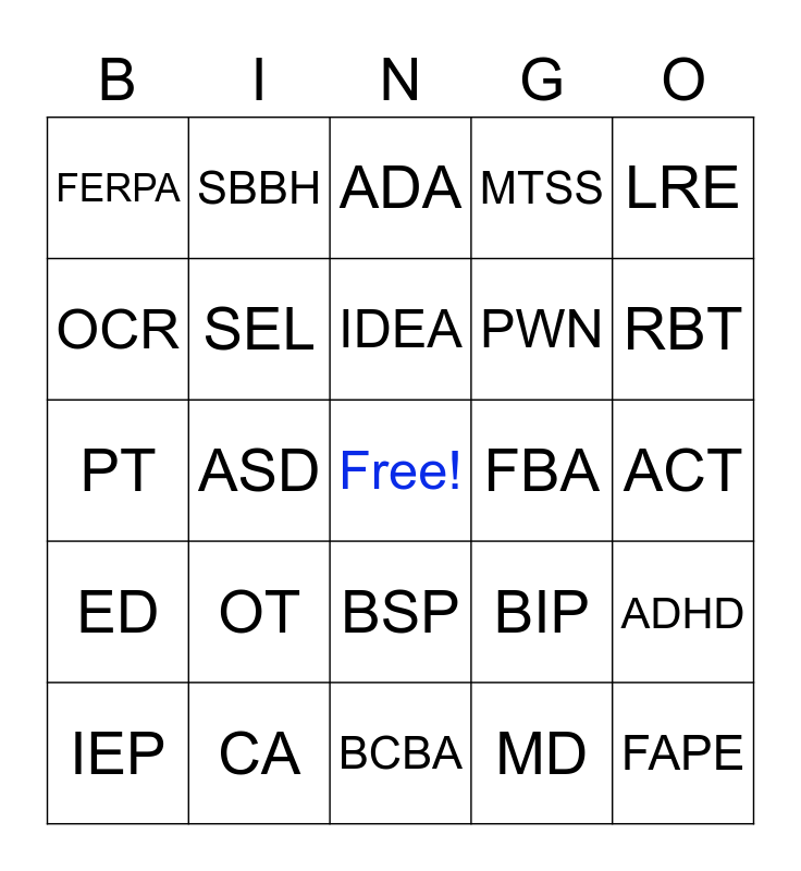 This bingo card has a free space and 34 words: LRE, MD, PLEP, ID, ED, SEL, LRE, IEP, SBBH, BHS, IDEA, ADA, SLD, SLP, FBA, RBT, CA, PT, OT, BIP, BSP, ABA, FERPA, ACT, BCBA, FAPE, MTSS, PBIS, PWN, OCR, DD, ASD, ADHD and CAMHD.