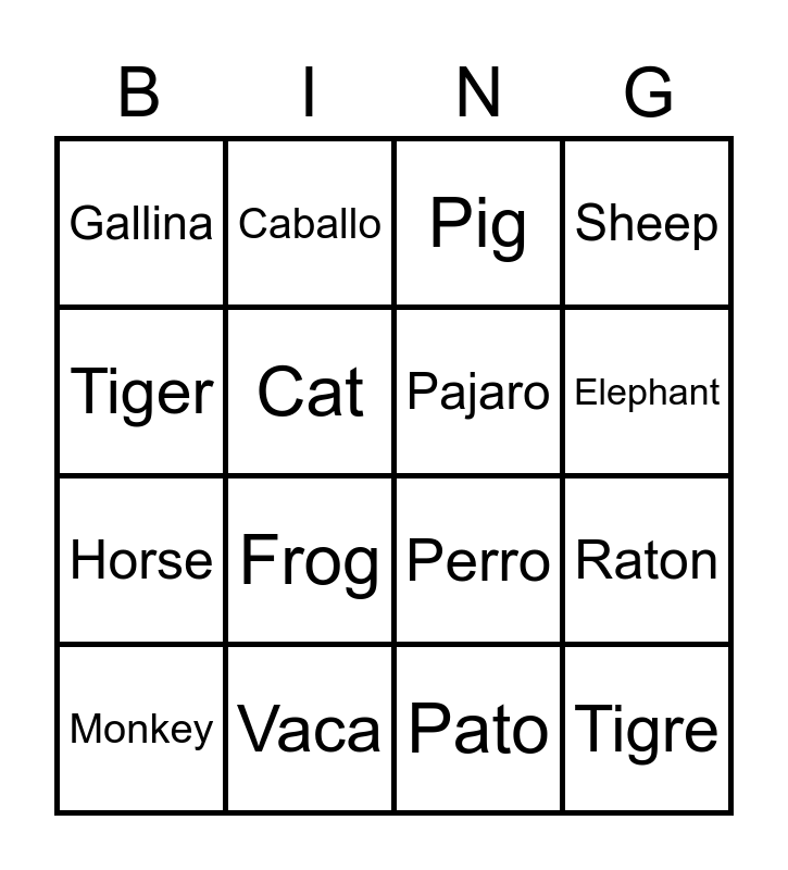 This bingo card has 30 words: Ardilla, Mono, Pato, Overja, Gallina, Caballo, Pajaro, Tigre, Free!, Vaca, Cerdo, Raton, Elefante, Rana, Perro, Conejo, Mouse, Frog, Dog, Sheep, Monkey, Chicken, Pig, Elephant, Tiger, Cat, Cow, Rabbit, Horse and Bird.