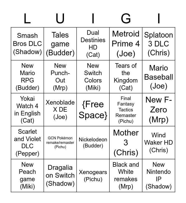 This bingo card has a free space and 24 words: GCN Pokémon remake/remaster (Pichu), Dragalia on Switch (Shadow), New Switch Colors (Miki), New Peach game (Miki), Splatoon 3 DLC (Chris), Smash Bros DLC (Shadow), New Mario RPG (Budder), Tales game (Budder), Final Fantasy Tactics Remaster (Pichu), Nickelodeon (Budder), Tears of the Kingdom (Cat), Yokai Watch 4 in English (Cat), Mother 3 (Chris), Wind Waker HD (Chris), New Punch-Out (Mrp), Black and White remakes (Mrp), New F-Zero (Mrp), Dual Destinies HD (Cat), Mario Baseball (Joe), Xenoblade X DE (Joe), New Nintendo IP (Shadow), Scarlet and Violet DLC (Pepper), Metroid Prime 4 (Joe) and Xenogears (Pichu).