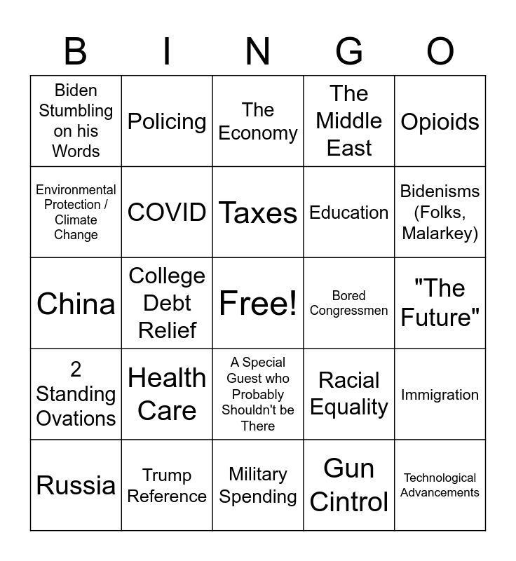 This bingo card has a free space and 28 words: Immigration, Jobs, Education, Gun Cintrol, Environmental Protection / Climate Change, The Economy, Policing, 2 Standing Ovations, Bored Congressmen, Russia, China, The Middle East, Trump Reference, Military Spending, Bidenisms (Folks, Malarkey), Infrastructure, Health Care, COVID, Taxes, A Special Guest who Probably Shouldn't be There, Biden Stumbling on his Words, Quotes a Former President, Technological Advancements, College Debt Relief, "The Future", Racial Equality, Opioids and Democracy.