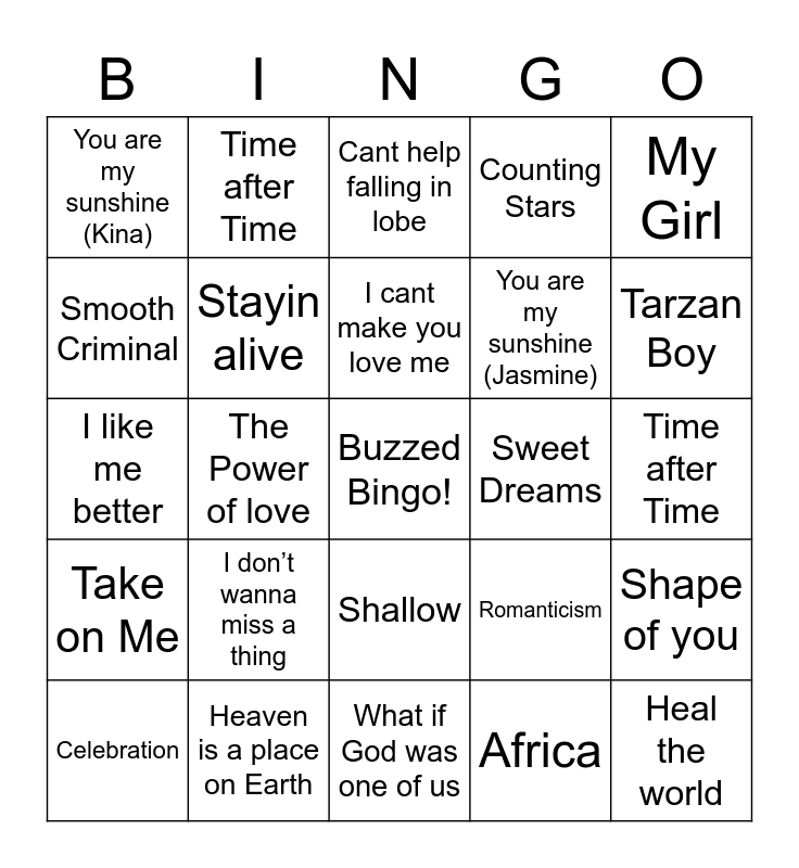 This bingo card has a free space and 70 words: Total Eclipse of the Heart, Time after Time, Right Here Waiting, You’re Still the One, Heaven is a place on Earth, Stand By you, Counting Stars, Shes so high, My Girl, Starships, Shape of you, Hobbit Drinking Medley, You are my sunshine (Kina), Cant help falling in lobe, Halo, The Power of love, Shallow, You are my sunshine (Jasmine), Torn, Take on Me, Sweet Dreams, Romanticism, Tarzan Boy, Dancing on the Ceiling, Running up that hill, Got My mind set on you, Don’t stop the dance, Jack & Diane, Africa, Let it be, Time after Time, I want it that way, I’ll stand by you, Don’t stop believing, Cant help falling in love, At the beginning, Don’t you want me, It’s my life, Candle in the wind, Smooth Criminal, Dynamite, I don’t wanna miss a thing, Heal the world, What are words, Two Words, Stayin alive, Celebration, Video killed the Radio Star, Kids in America, Nothings Gonna Stoop us now, Boston, Pour some Sugar on Me, When you say nothing at all, Heaven is a place on earth (The Mayries), What if God was one of us, I’ll be there for you (acoustic), I cant make you love me, Ring them Bells, Running up that hill ( Meg Myers), Yellow Submarine, I like me better, Despacitio, My brothers Best Friend, Everybody wants to rule the world, Torn, I want to hold your hand, I do it for you, Iris (Sleeping with Sirens), Since you been gone and Smooth.