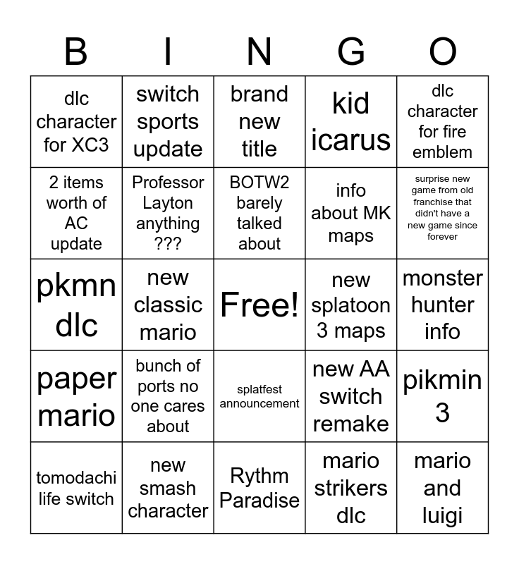 This bingo card has a free space and 24 words: bunch of ports no one cares about, new smash character, BOTW2 barely talked about, tomodachi life switch, dlc character for fire emblem, dlc character for XC3, 2 items worth of AC update, switch sports update, new splatoon 3 maps, splatfest announcement, info about MK maps, pkmn dlc, new AA switch remake, pikmin 3, Professor Layton anything ???, mario strikers dlc, monster hunter info, brand new title, surprise new game from old franchise that didn't have a new game since forever, new classic mario, mario and luigi, paper mario, kid icarus and Rythm Paradise.