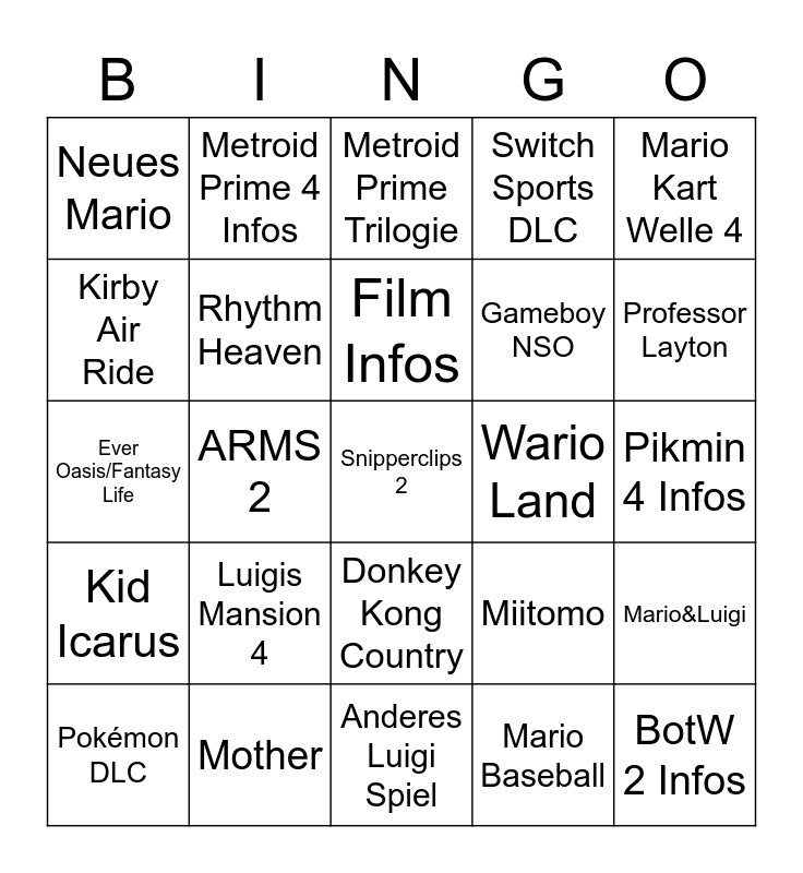 This bingo card has 25 words: Luigis Mansion 4, Anderes Luigi Spiel, Film Infos, Pokémon DLC, Mario Kart Welle 4, Neues Mario, Kirby Air Ride, Metroid Prime 4 Infos, Wario Land, Donkey Kong Country, Gameboy NSO, Ever Oasis/Fantasy Life, Miitomo, Mario&Luigi, Rhythm Heaven, BotW 2 Infos, Pikmin 4 Infos, Metroid Prime Trilogie, Professor Layton, ARMS 2, Snipperclips 2, Mother, Kid Icarus, Switch Sports DLC and Mario Baseball.