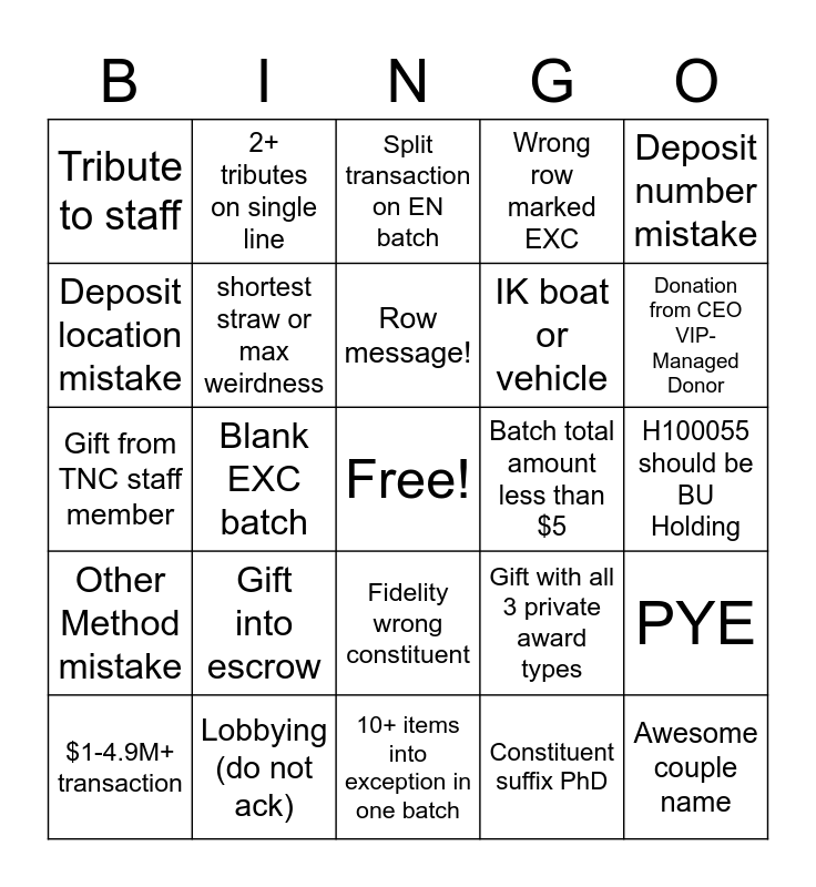This bingo card has a free space and 65 words: 2+ batch pages, Celebrity gift, Copy/photo of cash, PYE, 15+ EXC status in q, Canada batch =>$50,000CAD, 2+ tributes on single line, Credit card lease payment, Row message!, PAC Match, Fidelity wrong constituent, EXC4, H100055 should be BU Holding, Deposit number mistake, Deposit date mistake, Deposit location mistake, Blank EXC batch, Tribute to staff, Rev Cat with Application Other (ERR007), IK boat or vehicle, Gift into escrow, Other Method mistake, Wrong row marked EXC, H10005 ADK gift, Carbon offset/retirement, Unrestricted DAF/trb 4002, Unallowable PP, Awesome individual name, Awesome couple name, $5M+ transaction, $1-4.9M+ transaction, $500k-999k transaction, Mbrshp designation incorrectly changed, In-Kind Rev Cat 400200, Gift with all 3 private award types, Lobbying (do not ack), Most fun fund name, Gift from TNC staff member, Constituent suffix PhD, TNC/BU climate gift 4002 mistake, shortest straw or max weirdness, CT EXC, Batch total amount less than $5, Fund name with animals in it, 100+pgs of docs for 1 transaction, Oak leaf logo on remit device, Donation from CEO VIP-Managed Donor, Donor first name starts "Y", Books code missing, or drops off, Undesignated DAF intended for endowment, Anon/unk with fin mgmt co as constituent, Docs way out of order, >1 currency type in Non-US template, 10+ items into exception in one batch, Gift in honor of a pet, PP on conditional pledge, Typo in formal proposal version, Split transaction on EN batch, 20+ batch items no EXC, Manually add UCPP to tracker, Batch misassigned to BU, Batch misassigned to MKG, Holding Purpose and GRIP-UT note, misassigned UCPP and No proof of deposit.