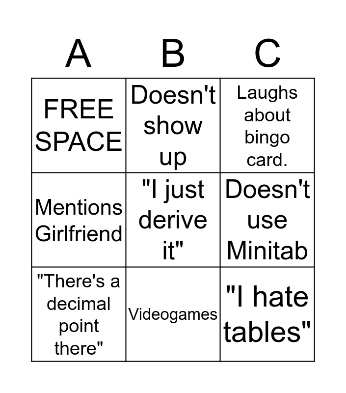 This bingo card has 9 words: "There's a decimal point there", Laughs about bingo card., Doesn't show up, Mentions Girlfriend, FREE SPACE, Doesn't use Minitab, "I just derive it", "I hate tables" and Videogames.