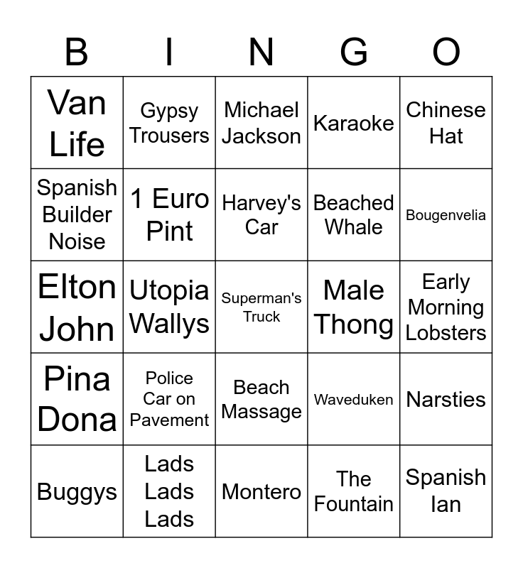 This bingo card has 49 words: Yellow Clown Car, Superman's Truck, Munchito Truck, Montero, Police Car on Pavement, Police Bike on Pavement, Gypsy Trousers, Shack, Spanish Builder Noise, Paramotor, 1 Euro Pint, Karaoke, Narsties, Waveduken, Level 10 Sunburn, The Arms, Harvey's Car, Male Thong, Prom Budgie, Chinese Hat, Utopia Wallys, The Fountain, Van Life, Beached Whale, Bootcamp, Bougenvelia, Buggys, Flyboard, Beach Massage, Pina Dona, Sierra Gonzales Bus, Wally Trolley, Public Urination, Monk, Lads Lads Lads, Bin Surfer, Hair Braiding, Busy Bodies, Early Morning Lobsters, Dorada, Lurker, Spanish Liz, Spanish Ian, Fake Liam, Elton John, Michael Jackson, Elvis, Paraglider and Sexy Photoshoot.