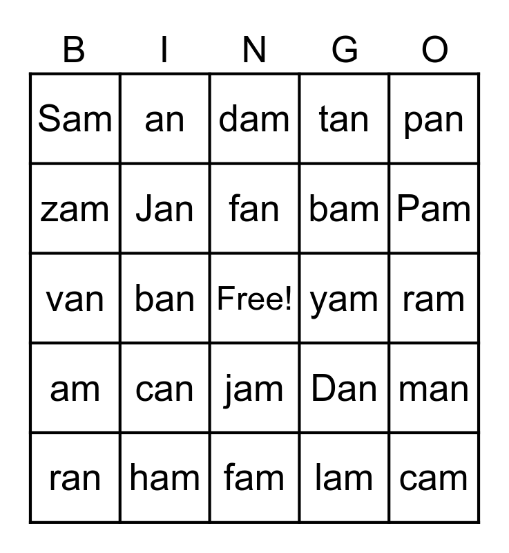 This bingo card has a free space and 24 words: can, ham, fan, ran, pan, Sam, zam, an, yam, jam, bam, van, Dan, man, Jan, lam, ram, dam, Pam, ban, cam, am, tan and fam.