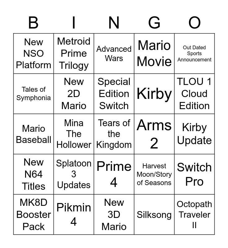 This bingo card has a free space and 24 words: Splatoon 3 Updates, Pikmin 4, Special Edition Switch, MK8D Booster Pack, Out Dated Sports Announcement, New NSO Platform, Tales of Symphonia, Metroid Prime Trilogy, Arms 2, Prime 4, Kirby, Mario Baseball, Harvest Moon/Story of Seasons, Switch Pro, New 2D Mario, Silksong, Kirby Update, Advanced Wars, TLOU 1 Cloud Edition, Mina The Hollower, Octopath Traveler II, New N64 Titles, Mario Movie and New 3D Mario.