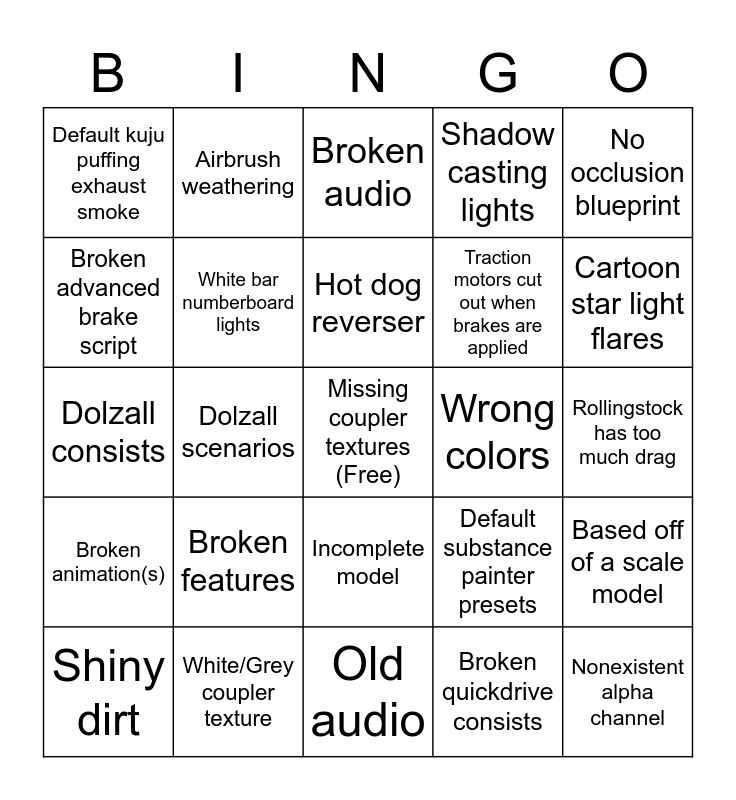 This bingo card has a free space and 24 words: Broken features, White/Grey coupler texture, Hot dog reverser, Shiny dirt, No occlusion blueprint, Default kuju puffing exhaust smoke, Broken advanced brake script, Airbrush weathering, Wrong colors, Incomplete model, Traction motors cut out when brakes are applied, Dolzall consists, Default substance painter presets, Based off of a scale model, White bar numberboard lights, Broken quickdrive consists, Rollingstock has too much drag, Broken audio, Cartoon star light flares, Dolzall scenarios, Nonexistent alpha channel, Broken animation(s), Shadow casting lights and Old audio.