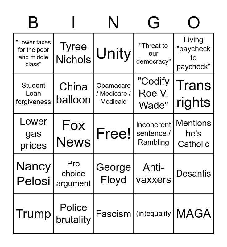 This bingo card has a free space and 44 words: Jan 6 Insurrection, MAGA, Right Wing radicals, Trump, (Systemic) racism, (in)equality, Unity, Tax the rich, Living "paycheck to paycheck", Police brutality, "Threat to our democracy", Incoherent sentence / Rambling, George Floyd, Pro choice argument, (Common sense) gun control, Fascism, More money for Ukraine, Lower gas prices, Highest employment, Trans rights, Tyree Nichols, Mass Shootings, Corporate greed, "Lower taxes for the poor and middle class", Claims Credit for Pandemic Recovery, Mentions he's Catholic, Misquotes someone or something, Election integrity, Anti-vaxxers, Nancy Pelosi, Ilhan Omar, Desantis, Climate change, "Tolerance", Fox News, Elon Musk, Defends illegal immigration, Denies we're in a recession, Obamacare / Medicare / Medicaid, Student Loan forgiveness, "Codify Roe V. Wade", Kamala Harris speaks, China balloon and "World War III" or "Civil War".