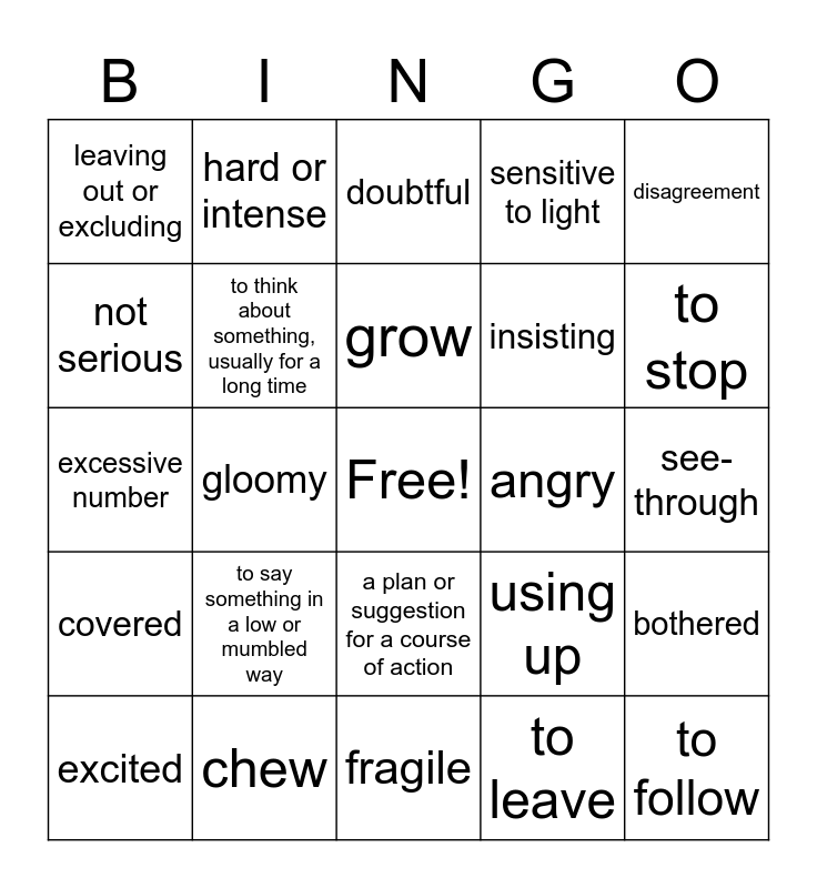 This bingo card has a free space and 34 words: Hard to understand, to leave, having no interest or concern, confused, covered, to think about something, usually for a long time, disagreement, excited, hard or intense, to have feelings for, grow, doubtful, to avoid or stay away from, detective, angry, to stop, chew, excessive number, to say something in a low or mumbled way, using up, a plan or suggestion for a course of action, something that is wildly unreasonable, leaving out or excluding, see-through, fragile, to follow, sensitive to light, wondered, insisting, not serious, to follow, gloomy, bothered and exhausted.
