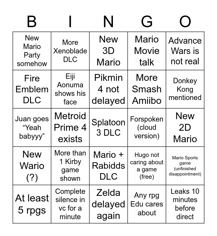 This bingo card has 25 words: More than 1 Kirby game shown, Zelda delayed again, Pikmin 4 not delayed, At least 5 rpgs, Advance Wars is not real, New Mario Party somehow, Fire Emblem DLC, More Xenoblade DLC, Forspoken (cloud version), Mario + Rabidds DLC, More Smash Amiibo, Juan goes “Yeah babyyy”, Hugo not caring about a game (free), Mario Sports game (unfinished disappointment), Eiji Aonuma shows his face, Leaks 10 minutes before direct, New 2D Mario, New 3D Mario, Donkey Kong mentioned, Metroid Prime 4 exists, Splatoon 3 DLC, Complete silence in vc for a minute, New Wario (?), Mario Movie talk and Any rpg Edu cares about.
