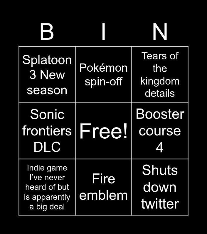 This bingo card has a free space and 22 words: Splatoon 3 New season, Mario movie details, Pokémon spin-off, GameCube Nintendo online, Booster course 4, Indie game I’ve never heard of but is apparently a big deal, Splatoon 3 New season, Tears of the kingdom details, New Mario game, Sonic frontiers dlc reveal, Booster course 4, Sonic frontiers DLC, Ryan Reynolds, Lazy game for 60 dollars, Big man amibo, Indie game I’ve never heard of but is apparently a big deal, Lazy old game switch port marked up for $60, *insert game here* direct coming soon, Tears of the kingdom details, Shuts down twitter, Fire emblem and Big man amibo.