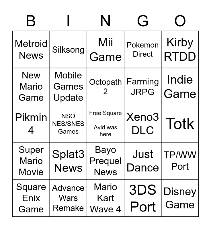 This bingo card has a free space and 24 words: Splat3 News, Advance Wars Remake, Octopath 2, Square Enix Game, Kirby RTDD, Metroid News, New Mario Game, Silksong, Xeno3 DLC, Bayo Prequel News, Farming JRPG, Pikmin 4, Just Dance, TP/WW Port, Mobile Games Update, 3DS Port, Totk, Mii Game, Indie Game, NSO NES/SNES Games, Disney Game, Super Mario Movie, Pokemon Direct and Mario Kart Wave 4.