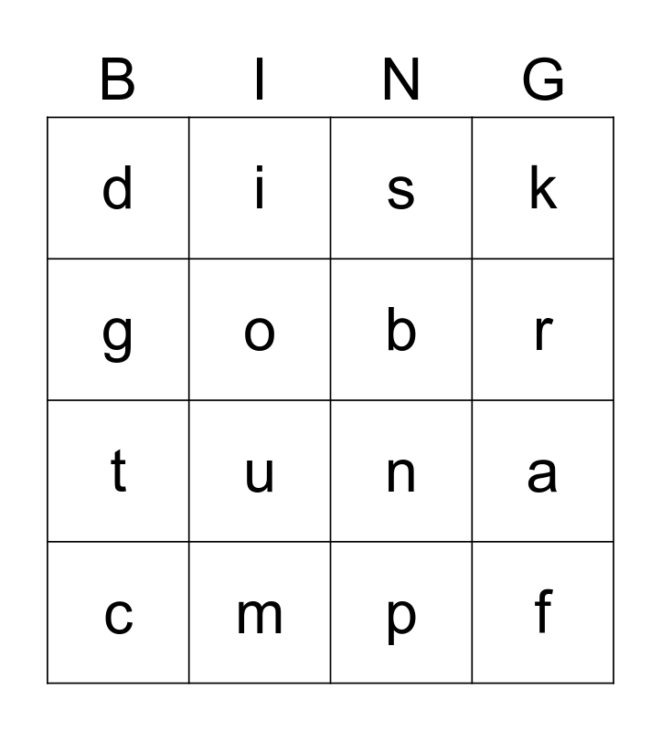 This bingo card has 16 words: m, a, s, d, t, i, n, p, g, o, c, k, u, r, b and f.
