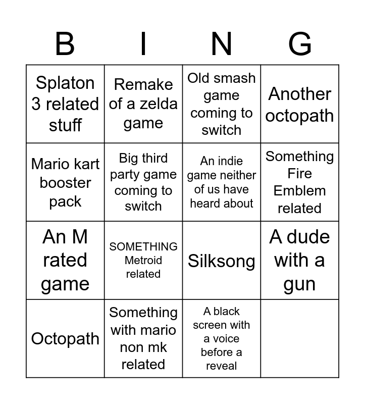 This bingo card has 16 words: Free!, Octopath, Remake of a zelda game, Old smash game coming to switch, Something Fire Emblem related, Splaton 3 related stuff, SOMETHING Metroid related, Silksong, Another octopath, Mario kart booster pack, Something with mario non mk related, An indie game neither of us have heard about, A dude with a gun, An M rated game, Big third party game coming to switch and A black screen with a voice before a reveal.