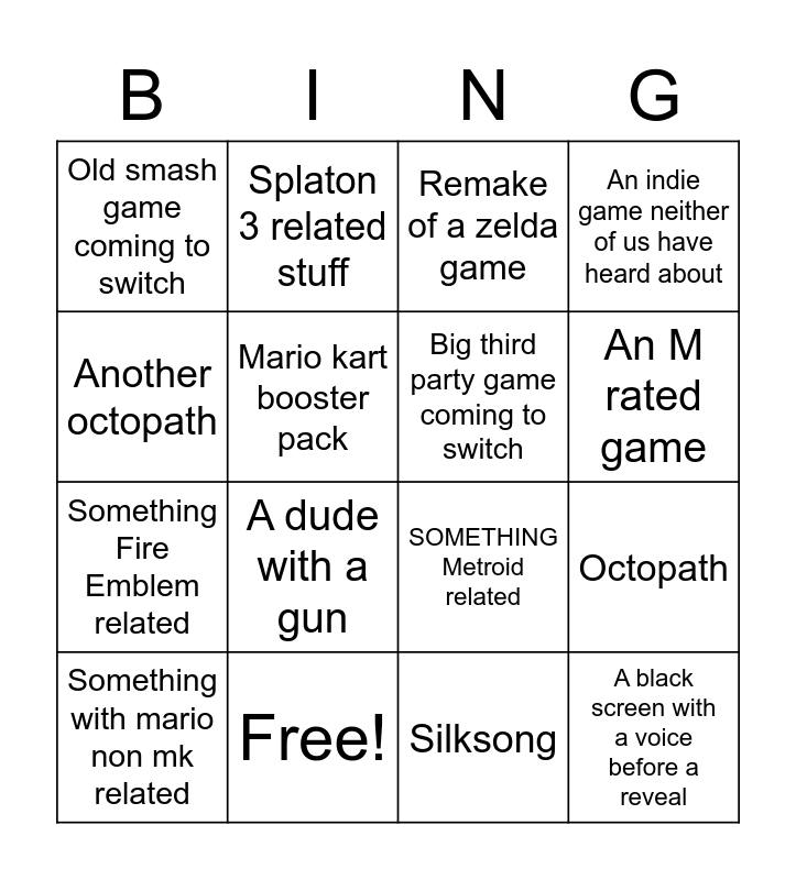 This bingo card has 16 words: Free!, Octopath, Remake of a zelda game, Old smash game coming to switch, Something Fire Emblem related, Splaton 3 related stuff, SOMETHING Metroid related, Silksong, Another octopath, Mario kart booster pack, Something with mario non mk related, An indie game neither of us have heard about, A dude with a gun, An M rated game, Big third party game coming to switch and A black screen with a voice before a reveal.